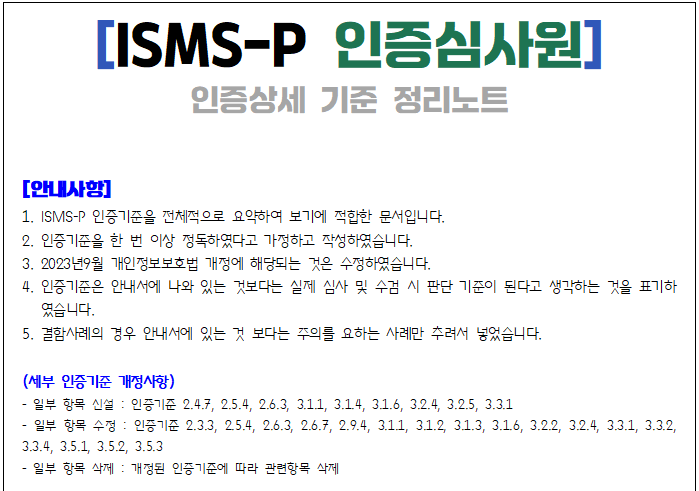 ISMS-P 인증 상세기준을 노트처럼 정리하는 것이 좋겠다 싶어서 안내서와 각종 지침서를 확인하고 정리해봄.